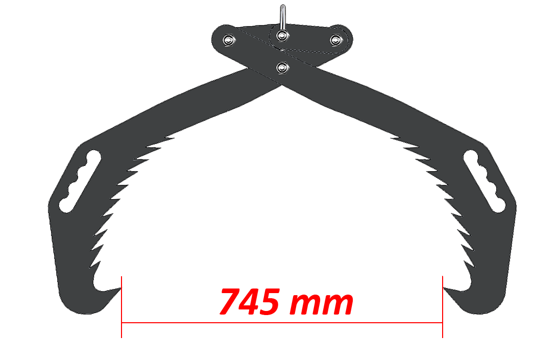 Portable manual forestry log tongs are equipped with a hook for quick and easy mounting and removal. The effective (working) width of the tongs ranges from 100 to 700 mm, while the maximum opening is 745 mm. The tongs are made of robust S355 structural steel with a thickness of 12 mm. The set includes the tongs, a mounting hook, and reinforced M20 bolts. The tongs are painted, providing additional protection against corrosion.