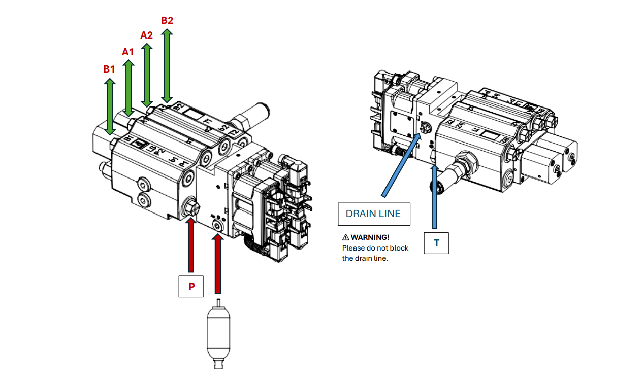 - Ja hidrauliskajā līnijā ir divi vārsti, pieslēdziet pirmā vārsta pārsūtīšanas izeju pie otrā vārsta spiediena ieejas.