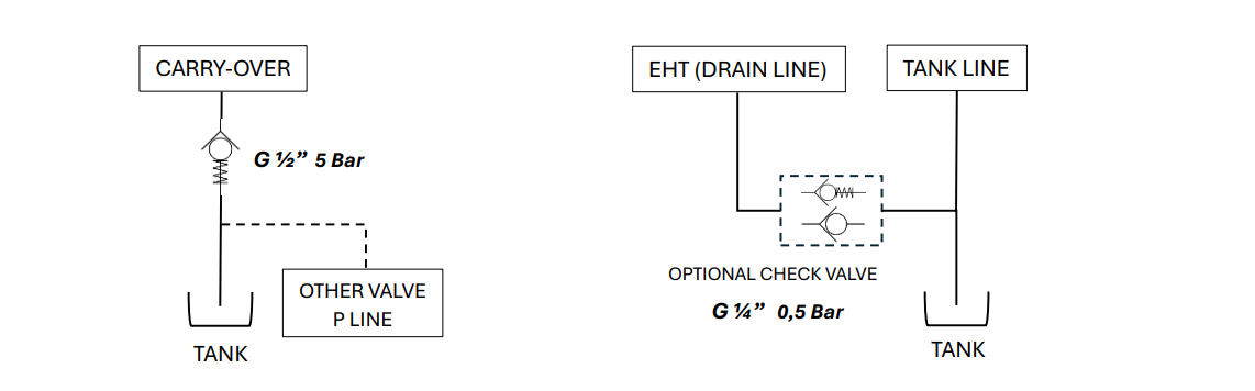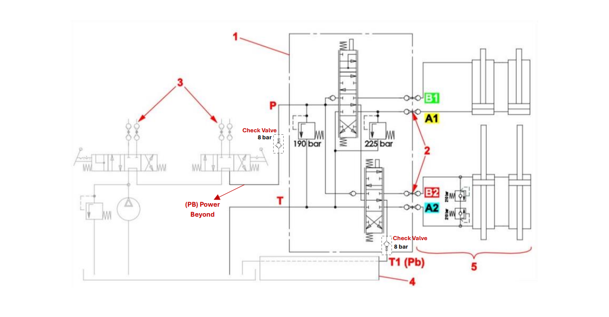 - T1 – spiediena pārsūtīšana (Power Beyond – “PB”) + 8 bāru atsperots pārbaudes vārsts