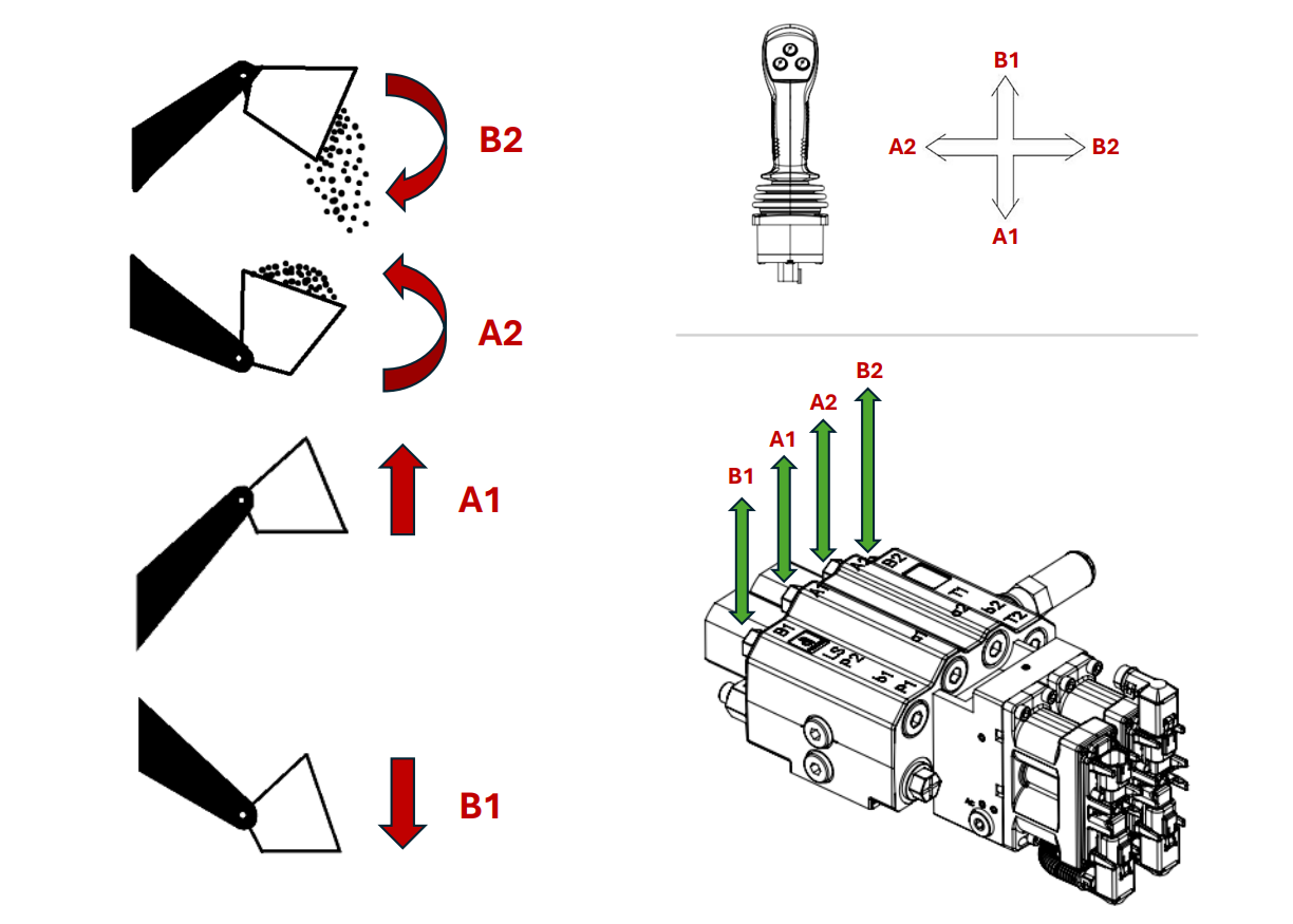 Peldošā funkcija: Pārvietojiet džostiku B1 (nolaišana) virzienā. Kamēr džostiks atrodas B1 pozīcijā, nospiediet peldošās funkcijas (FLOAT) pogu, lai aktivizētu peldošo režīmu. Brīdinājums: Nep veiciet šo darbību, ja iekrāvējs ir pacelts pārāk augstu.