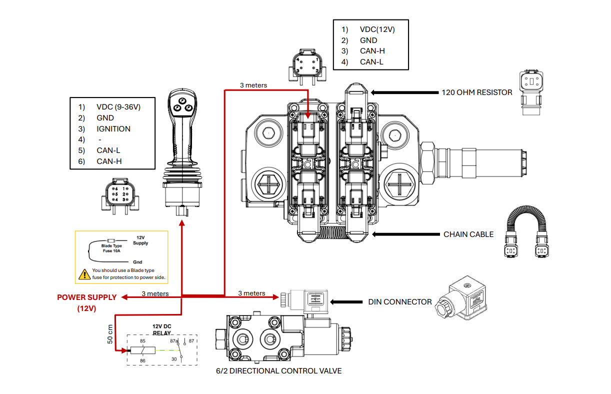 Komplektā iekļauts vārsts, proporcionālās vadības džostiks un elektroinstalācijas vadi.